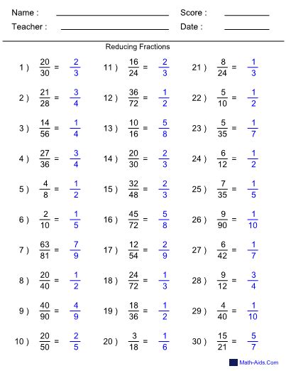 Reducing Fractions from www.dadsworksheets.com
