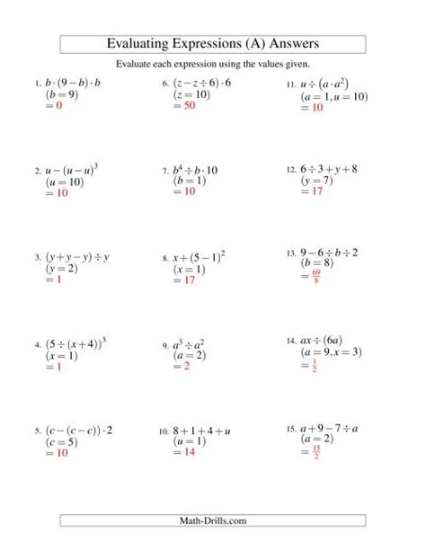 Math Drills Evaluating Expressions. Web evaluate the expression ( a − b) 2 if a = 3 and b = −5, at a = 3 and b = −5. 6 a (u a) (a=5;u=6) 2.